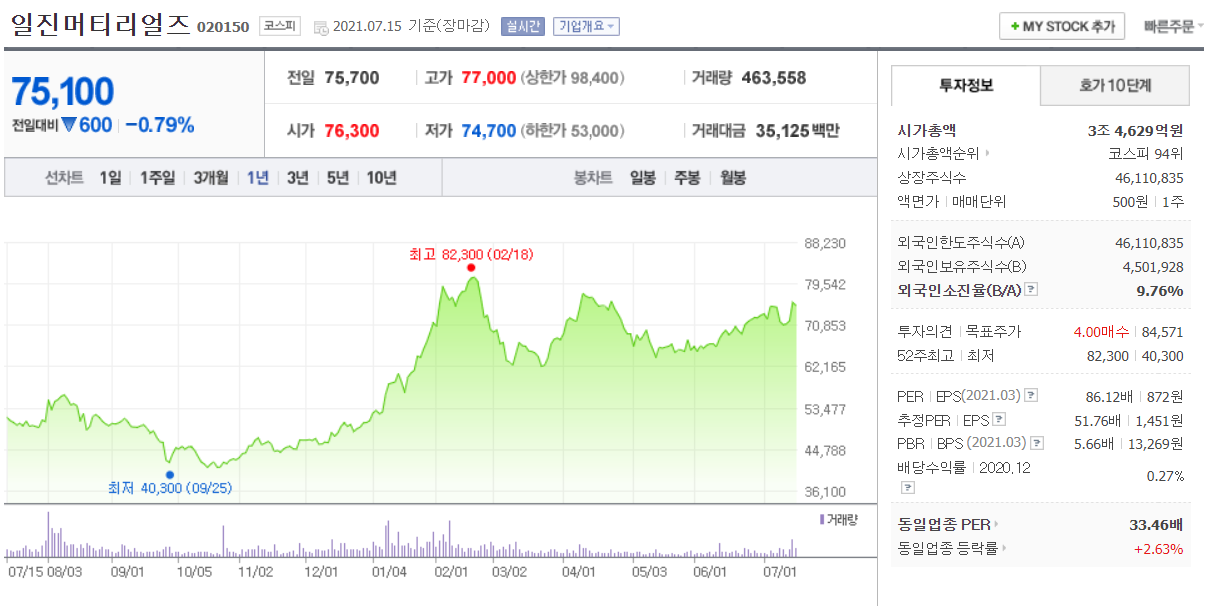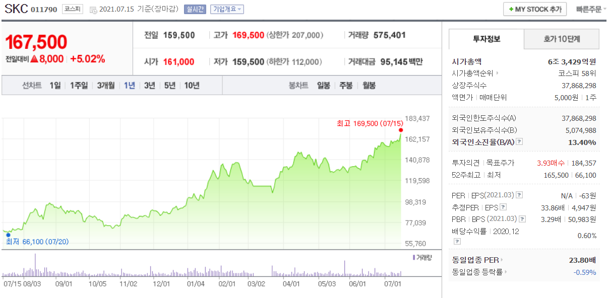 | 소재 | 종목 | 시가총액 (21년 7월 15일 기준) |