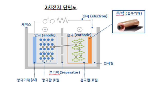 양극재는 리튬이온 소스로 배터리의 용량과 평균 전압을 결정하고, 음극재는 충전속도와 수명을 결정하는데, 양극에서 나온 리튬이온을 저장했다가 방출하면서 외부회로를 통해 전류를 흐르게 하는 역할을 한다