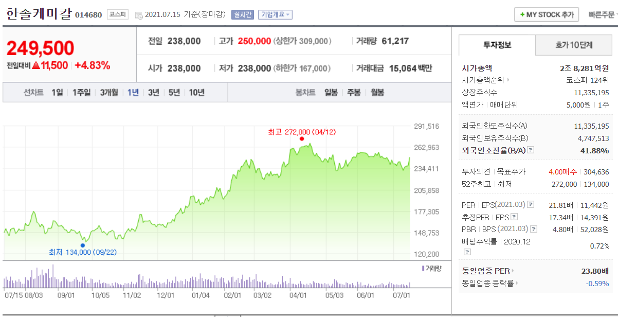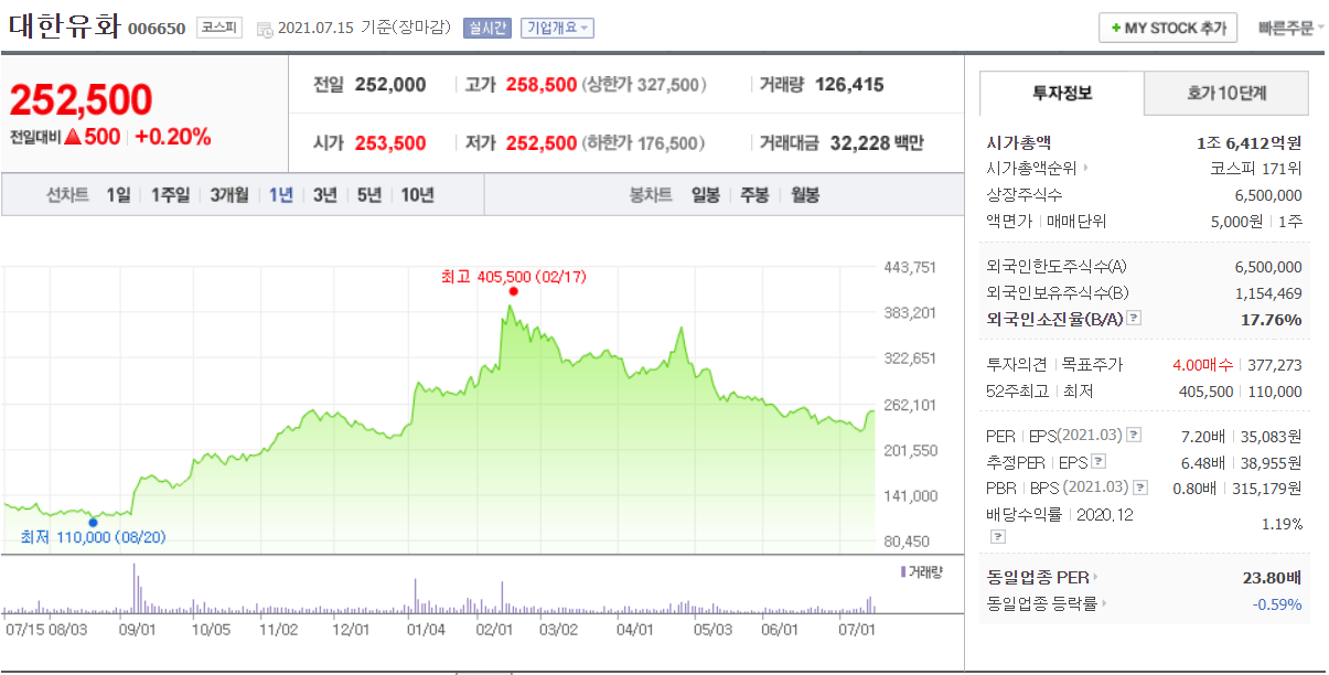 대한유화가 2차전지 소재 관련주로 주목을 받으면서 상승세다. 13일 오후 1시 35분 대한유화는 전 거래일 대비 1만8500원(8.11%) 오른 24만6500원에 거래되고 있다. 국내 2차전지 기업들의 공격적인 증