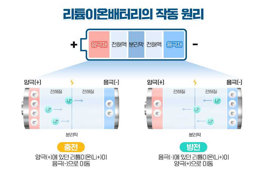 양극과 음극을 도선으로 이어주면(방전) 리튬 이온은 자연스럽게 전해액을 통해 다시 양극으로 이동하게 되고, 리튬이온과 분리된 전자(e-)는 도선을 따라 이동하면서 전기를 발생한다.