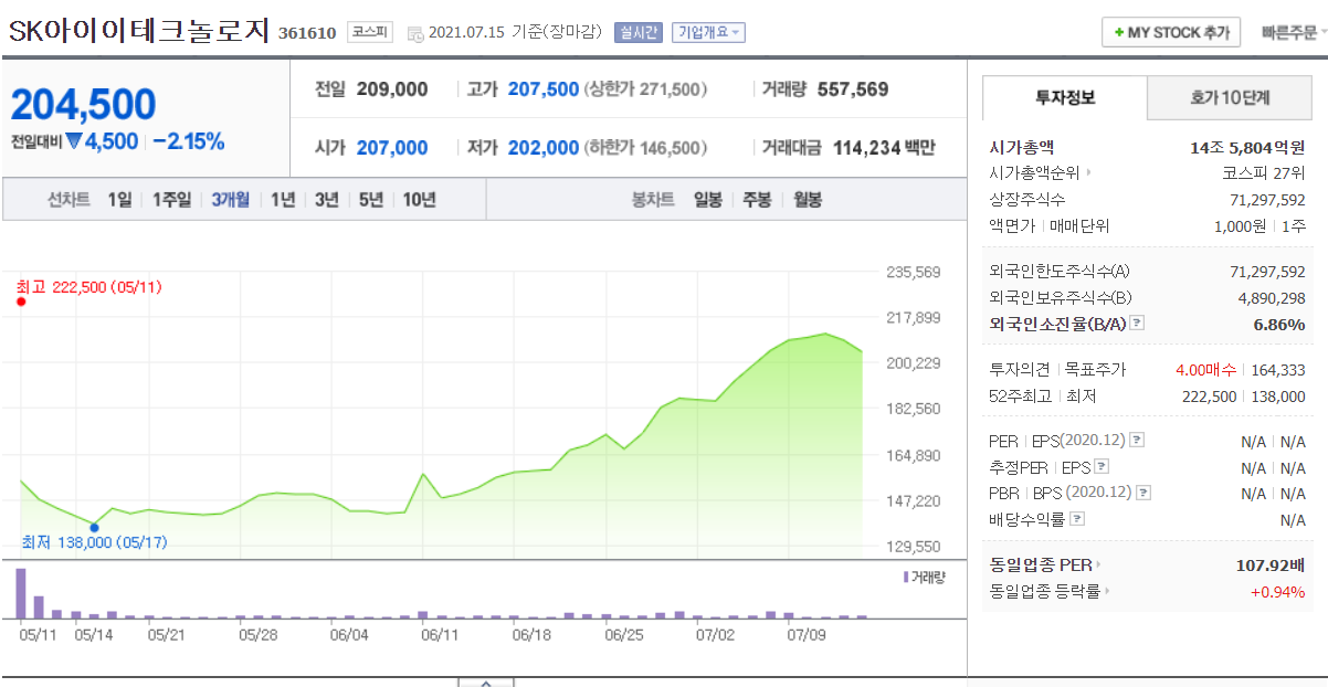 거침없는 SKIET…'배터리소재 대장株' 등극, 6월 이후 37%↑…20만원 탈환 시총 14조로 포스코케미칼 제쳐 분리막 시장 탄탄한 성장세 공격적 증설 투자로 매력 더해 "길게 보면 시총 30조도 가능"