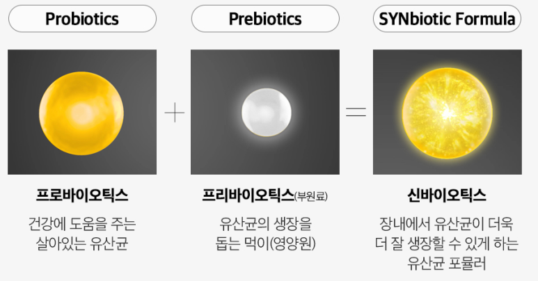 프로바이오틱스(유산균) + 프리바이오틱스(유산균 영양분) = 신바이오틱스(Synbiotics)라고 합니다.