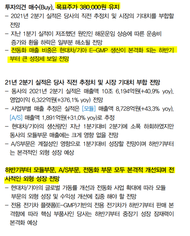E-GMP향 전동화 부품은 기존 친환경차 부품보다 재료비 하락 등을 통한 원가 절감이 두드러져 구조적인 수익성 개선을 기대