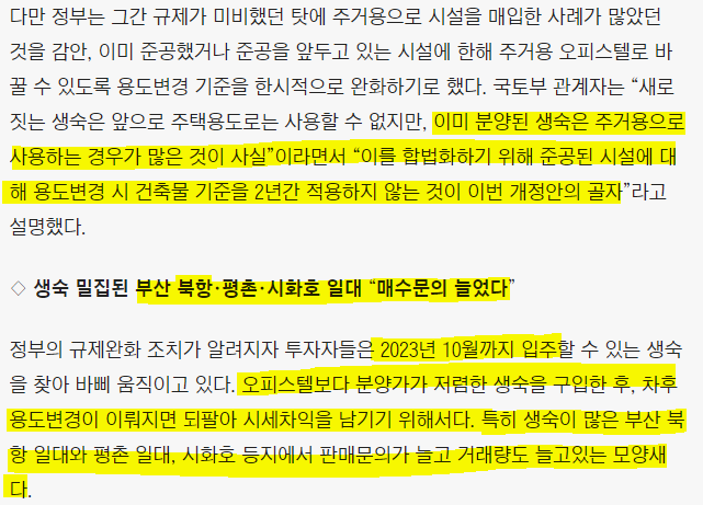 생활형숙박시설을 오피스텔로 용도변경을 2년 동안 허락한다고 발표를 했다..
