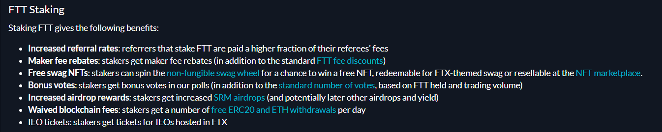 FTT 스테이킹을 했을 때의 혜택은 아래 그림과 같이 설명되어 있는데 수수료가 비싼 ERC20 코인 전송 수수료를 싸게 해주는것과 IEO ticket을 주는게 가장 큰 혜택으로 보임.