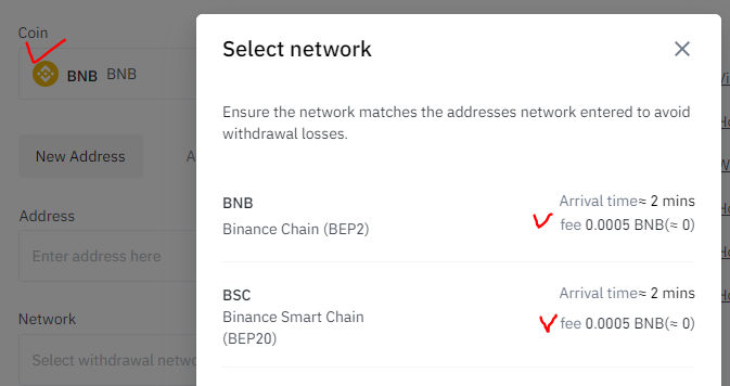 바이낸스에서 BNB를 FTX로 보내려고 하면 수수료는 0.0005BNB