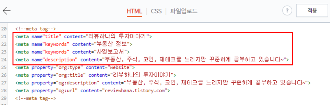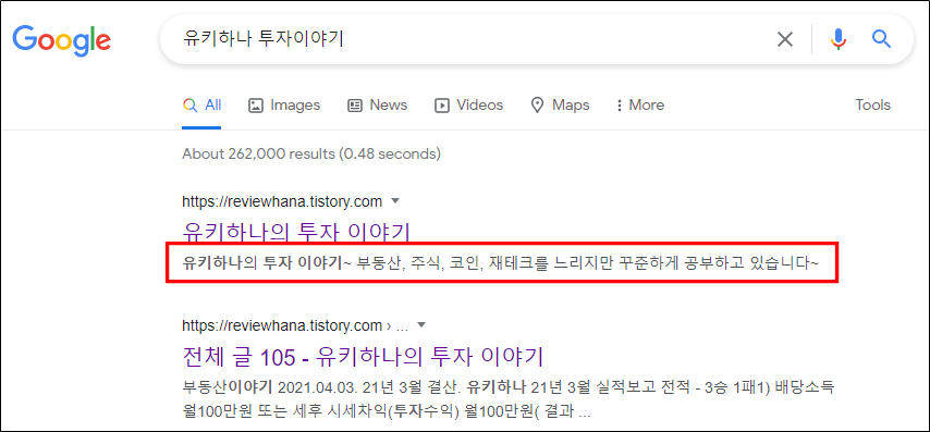 블로그 제목은 짧은 핵심 문구로 만들고 description 메타 태그는 블로그를 소개할 수 있는 문장 또는 짧은 단락 정도로 작성하면 좋습니다.