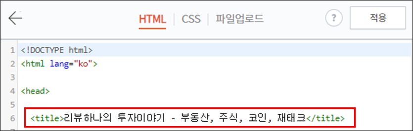 오디세이(Odyssey) 스킨 html 편집하기를 누르고 <title> 태그를 HTML 문서의 <head> 요소 내에 배치하고 내 블로그의 각 페이지에 사용할 고유한 제목을 만들어 보았습니다.