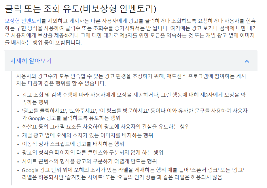 또는 글과 글 사이에 여백이 부족한 상태에서 광고가 들어가 있어 사용자가 광고를 누르게끔 유도한다거나 광고를 눌러달라고 텍스트를 작성하여 사용자를 유혹하는 경우도 구글이 싫어합니다.