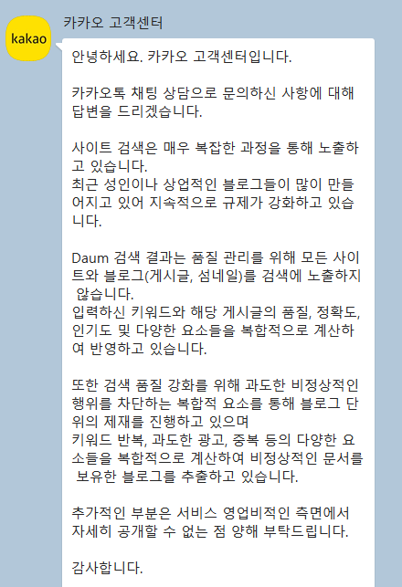카카오 고객센터에서 답변을 받으면 블로그 저품질 탈출에 대한 어떤 실마리를 얻을 수 있을 것으로 기대했는데 답변을 받지 못해서 블로그 저품질 탈출기에 적을 내용이 아직 없다..