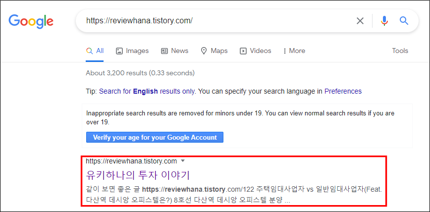 구글에서 블로그 주소를 검색하면 아래 그림과 같이 검색이 된다.