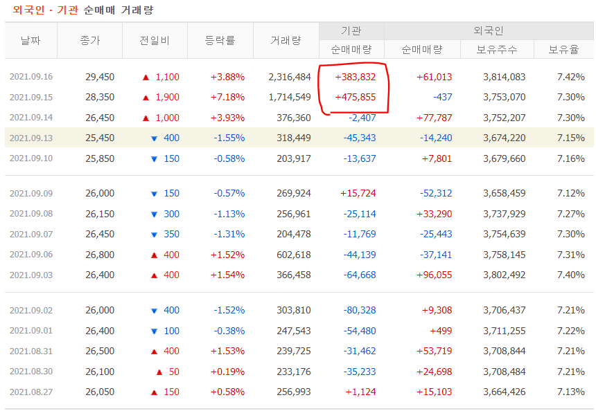 그동안 주가가 하락세여서 마음이 아팠는데 기관의 매수가 있었음