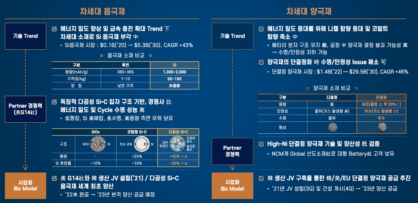 양극재는 NCM --> High Nickel NCMA + CNT(Carbon Nano Tube)로 발전하고 있음