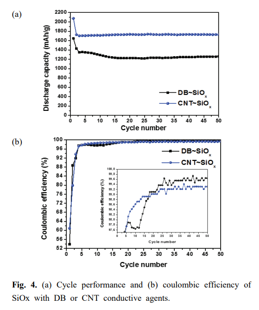 50회 충방전 동안의 용량 유지율은 DB 도전재를 사용한 경우와 CNT 도전재를 사용한 경우 각각 76%, 84%로 나타났다.