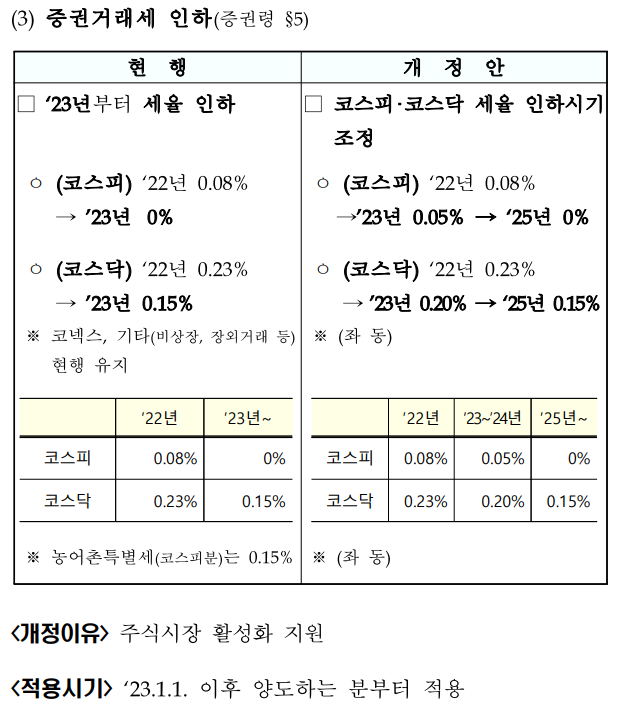 주식시장 활성화 지원하는데 왜 거래세율 인하시기를 늦추는거냐?