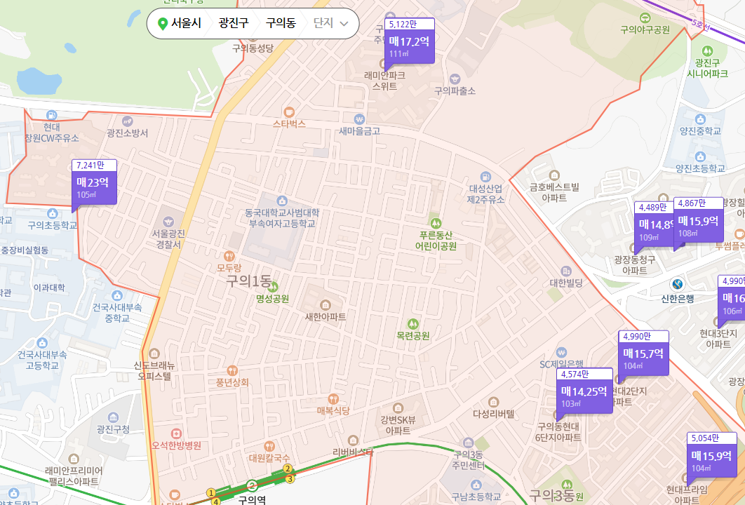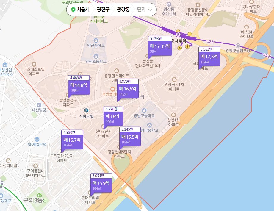 오늘은 7호선, 2호선, 5호선과 남쪽으로 한강 조망권을 가지고 있는 광진구를 살펴본다.