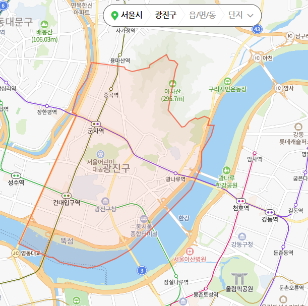 오늘은 7호선, 2호선, 5호선과 남쪽으로 한강 조망권을 가지고 있는 광진구를 살펴본다.