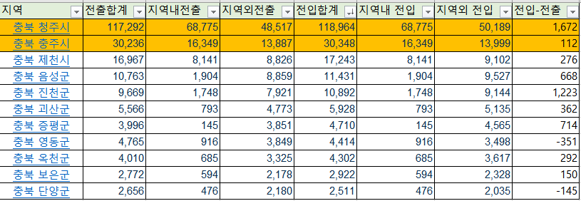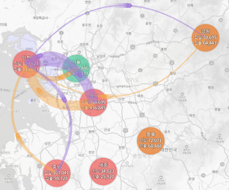 세종과 청주 사이에 전입/전출이 이루어진다는 것을 알게 되었음.