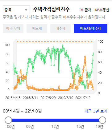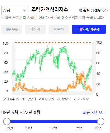 충북의 주택가격 심리지수를 살펴보면 매도심리는 80에 가까워지고 있고 , 충남은 매도심리가 60에 가까워지고 있다.