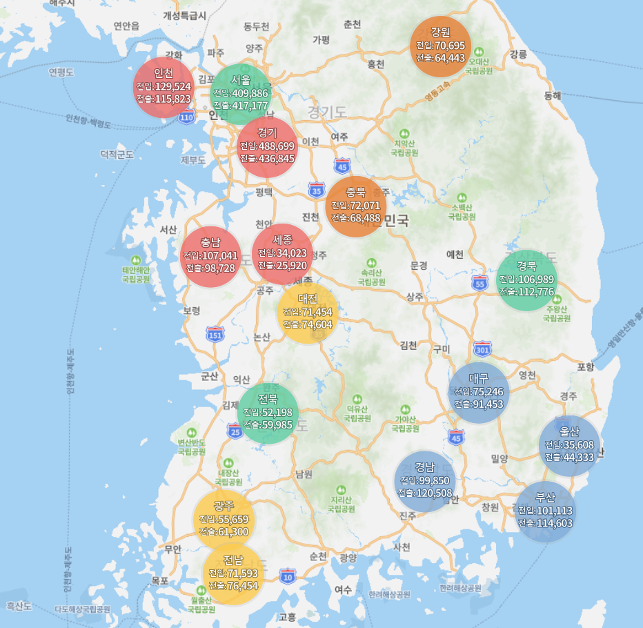 우선 22년 7월 기준 세대 전출입 기록을 살펴보고 어떤 지방으로 사람들이 몰리는지 확인해봤다.