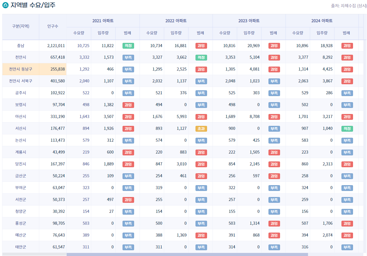 천안시 서북구가 아파트 공급이 24년까지 부족함