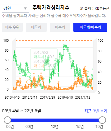 강원에서 주택 매도 심리는 높아지기 시작했고 매수심리는 떨어지고 있으니 시간이 조금 더 지나면 매도 심리가 60을 넘지 않을까?