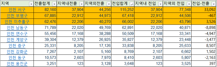 인천 안에서도 어느 구에 전입을 많이 하는지 살펴보니 바로 인천 서구, 부평구, 미추홀구였음