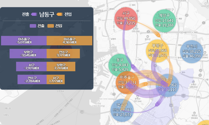 인천 남동구는 전입보다 전출이 많은데 새 아파트가 지어지면서 남동구에 있던 사람들이 서구, 미추홀구, 부평으로 돌아가는 게 아닐지?