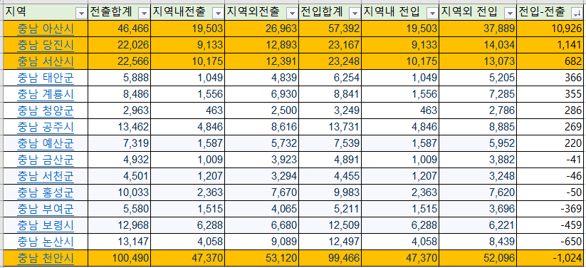 아산은 전입이 전출보다 1만 세대나 많으며, 천안은 전입/전출이 10만 세대나 된다.