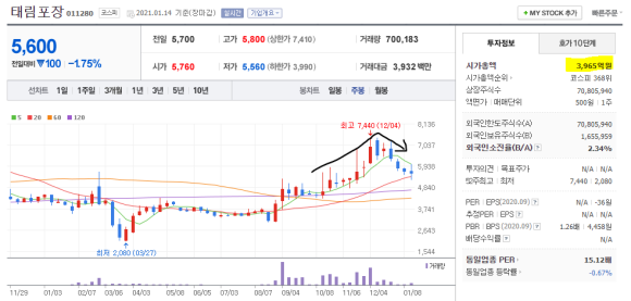 태림포장 주가 2019년 6월 최고가 9450원, 현재 5600원