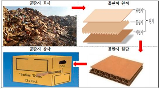 고지(폐지) --> 원지 --> 원단(판지) --> 골판지상자