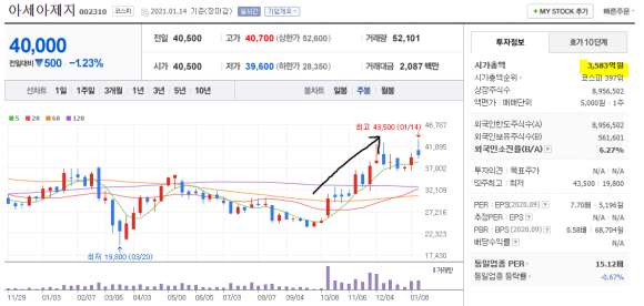 아세아제지 주가 2018년 9월 최고가 52000원, 현재 40000원
