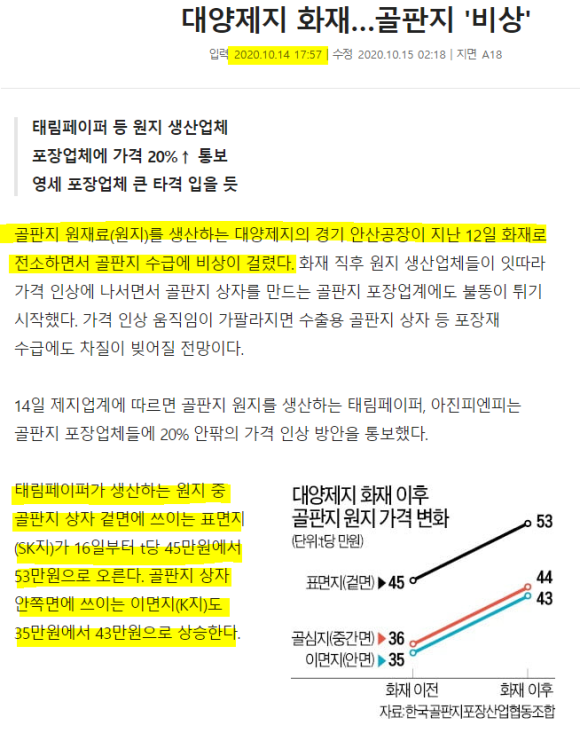 지난 대양제지공업(주) 안산공장의 화재(2020. 10. 12. 01시)로 골판지원지 수급균형이 급속히 붕괴되면서 골판지원지 〈 골판지 〈 골판지상자의 연쇄적 공급난이 현실화되었고, 거래가격도 연쇄적으로 인상 통지되고 있다. 화재발생 당일에 유수의 제지공장 두 곳에서 기다렸다는 듯이 가격 인상을 통지한 이래 2주가 경과한 시점에 이르러 대부분의 제지공장에서 조정가격이라는 명분을 달고 가격인상을 통지해 왔다. 화재 당일 인상통지라는 놀라운 반응에 대하여 경이롭게 바라보는 오해도 있었지만, 지난 7월 3일부로 환경부에서 폐지수입의 신고제 실시로 폐지수입이 사실상 장벽을 만나게 되면서 폐지 조달에 어려움이 가중되어 제조원가에 압박을 받아 왔다는 제지회사들로서는 달포 전부터 인상에 대한 입장을 흘리고 다녔다는 점에서 “당일화재 당일인상” 통지는 있을 수 있는 일이라고 생각한다.