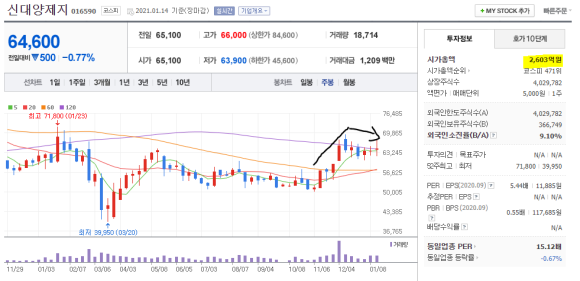 신대양제지 주가 2018년 9월 최고가 107500원, 현재 64600원