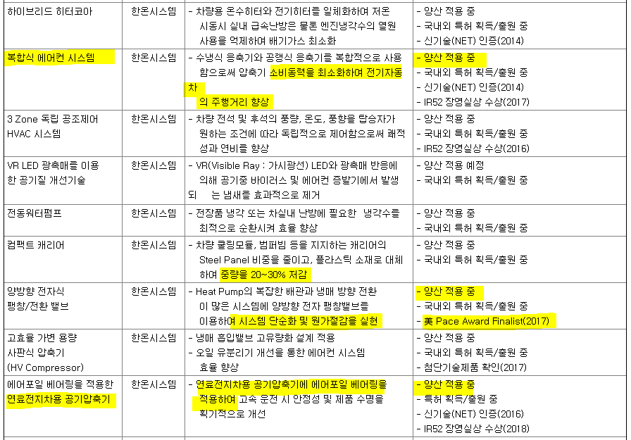 사업보고서에 나와있는 연구개발 이력을 보면 수소연료전지차에 사용되는 공기 공급장치, 쿨링팬등을 개발했고, 전기차에 사용되는 열관리 시스템을 개발하여 양산 적용 중입니다.