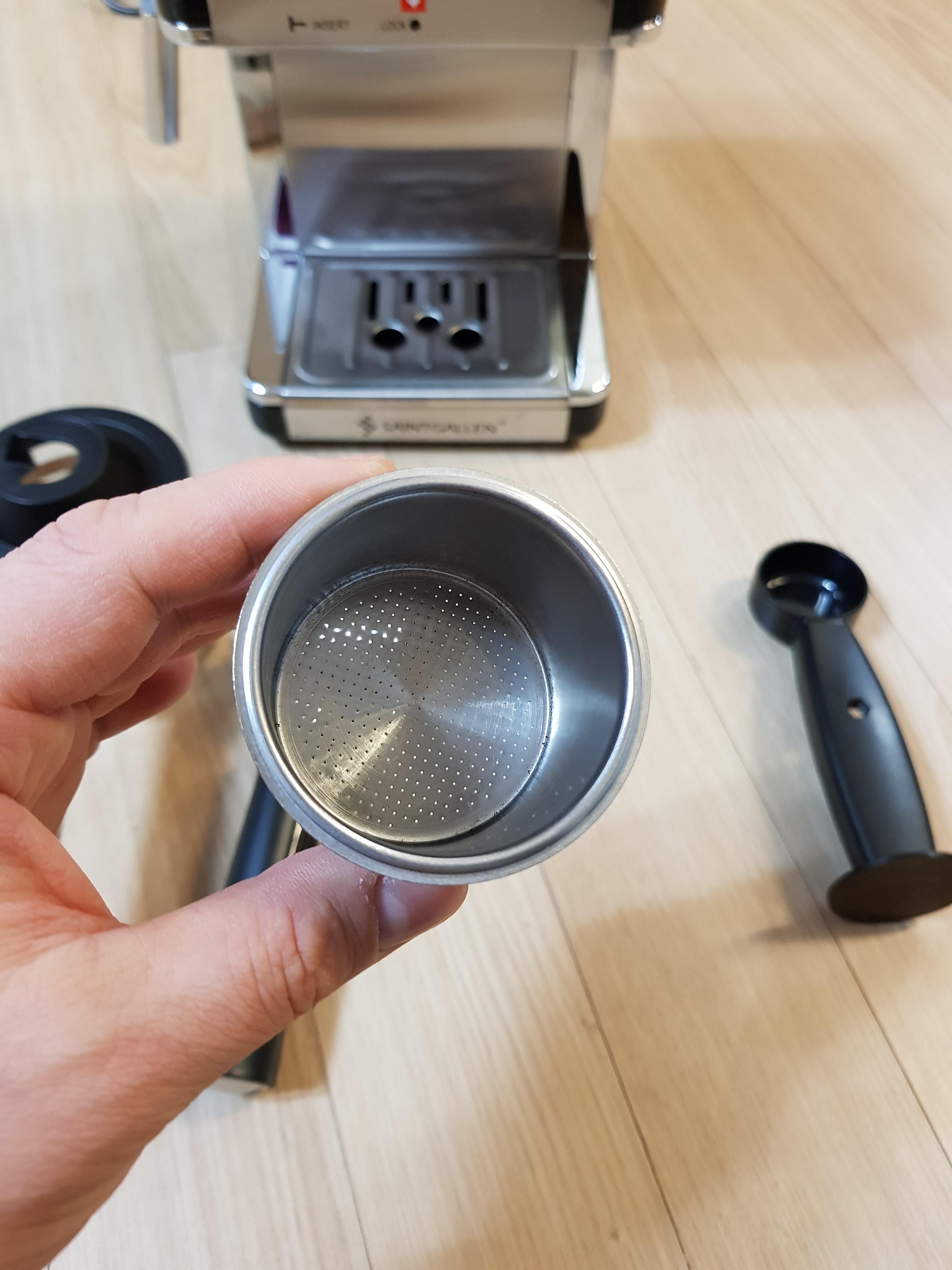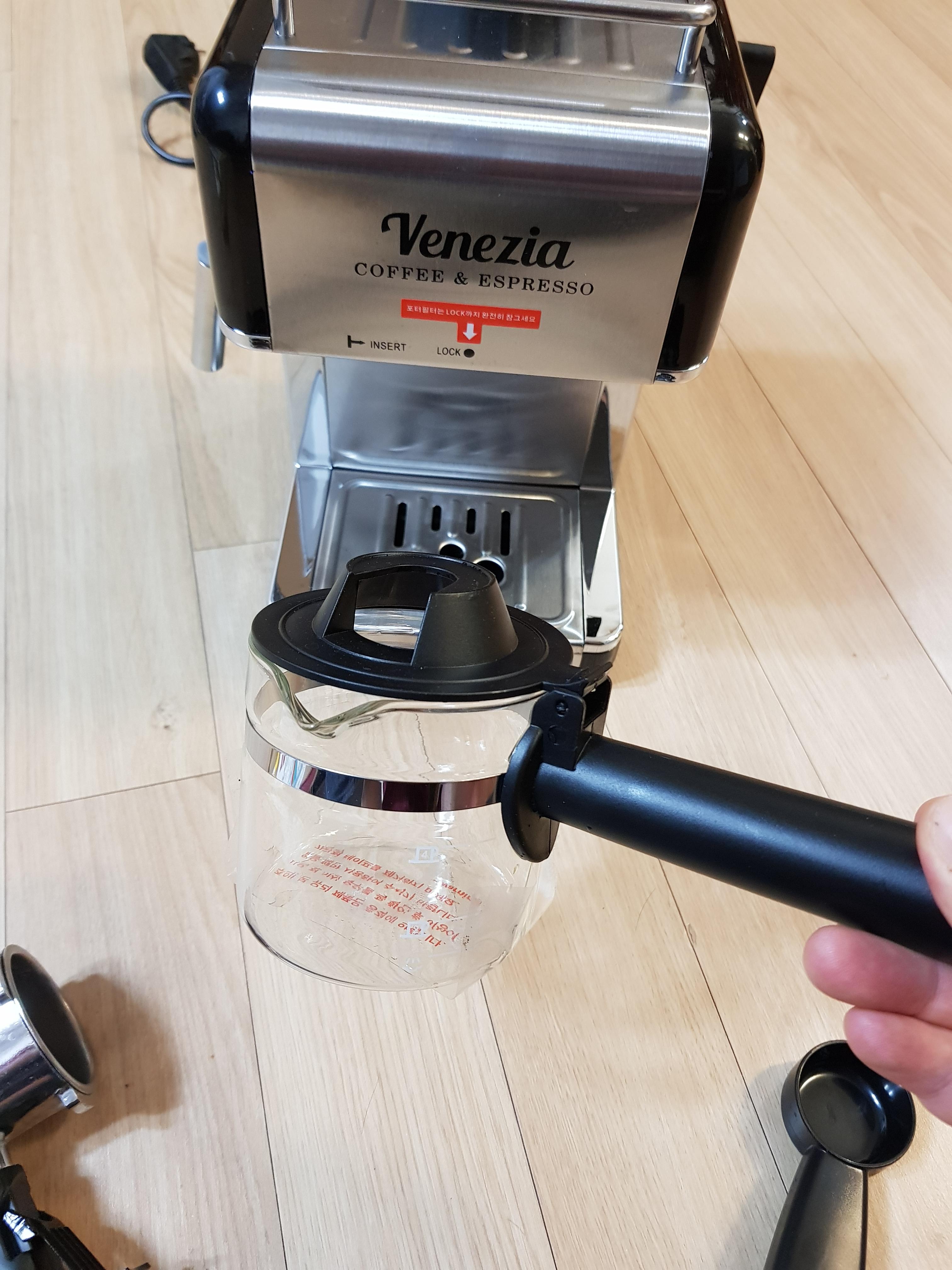 언박싱을 하면 아래와 같은 커피머신 본체, 주전자, 커피필터와 포터필터 구성품을 볼 수 있습니다.