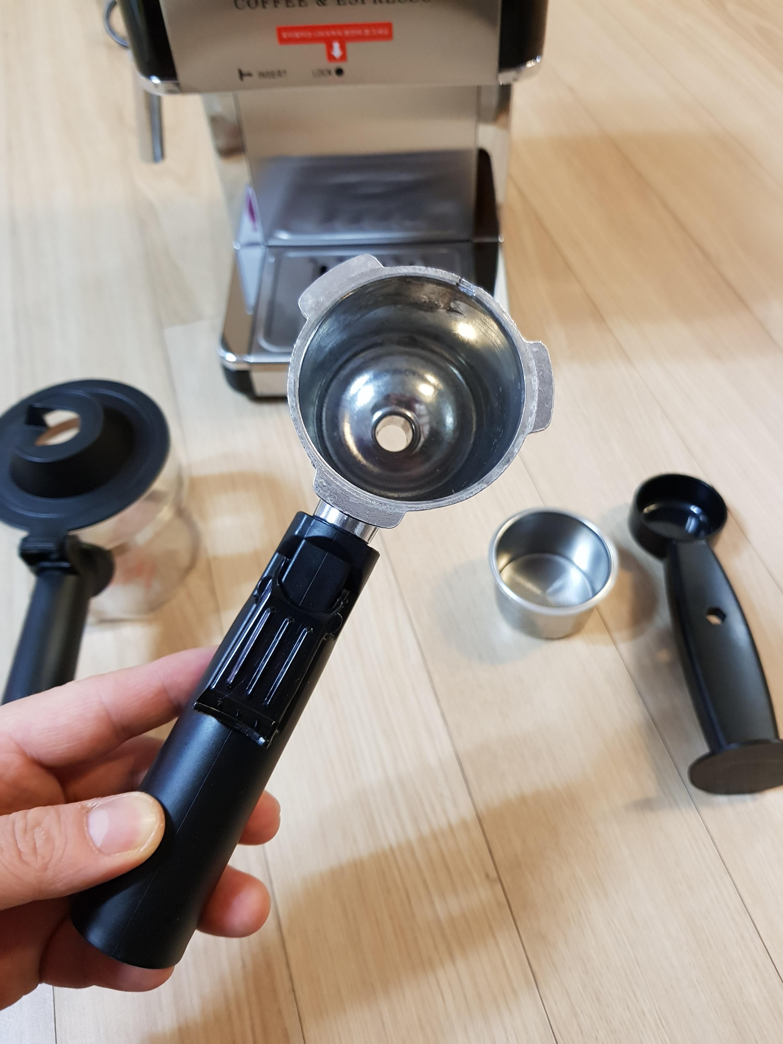 바리스타 분들이 하시는 것처럼 원두 넣고 살짝 원두 눌러주고 포터필터 끼우고 돌려주면 끝~