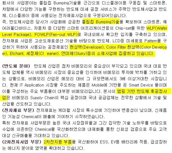 반도체 부문은 Flipchip bumping 기술, Fan-In WLP, Fan-Out PLP 등 패키징, 삼성전자 PMIC, 디스플레이 DDI(Display Driver IC) Bumping 공정으로 돈을 벌고 있고 차세대 패키지 기술을 확보한 것으로 알려지고 있습니다