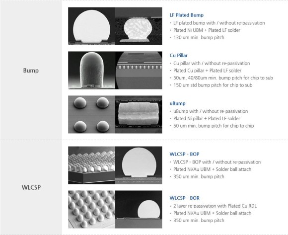 WLP(Wafer Level Package)는 그 다이를 일일이 자르지 않고 웨이퍼를 그대로 두고 반도체 회로와 외부 모듈을 이어줄 전극을 형성시킨다. 전극은 보통 은, 주석, 구리 등의 합금으로 이뤄진 솔더볼(Bump, 범프)이 쓰입니다.