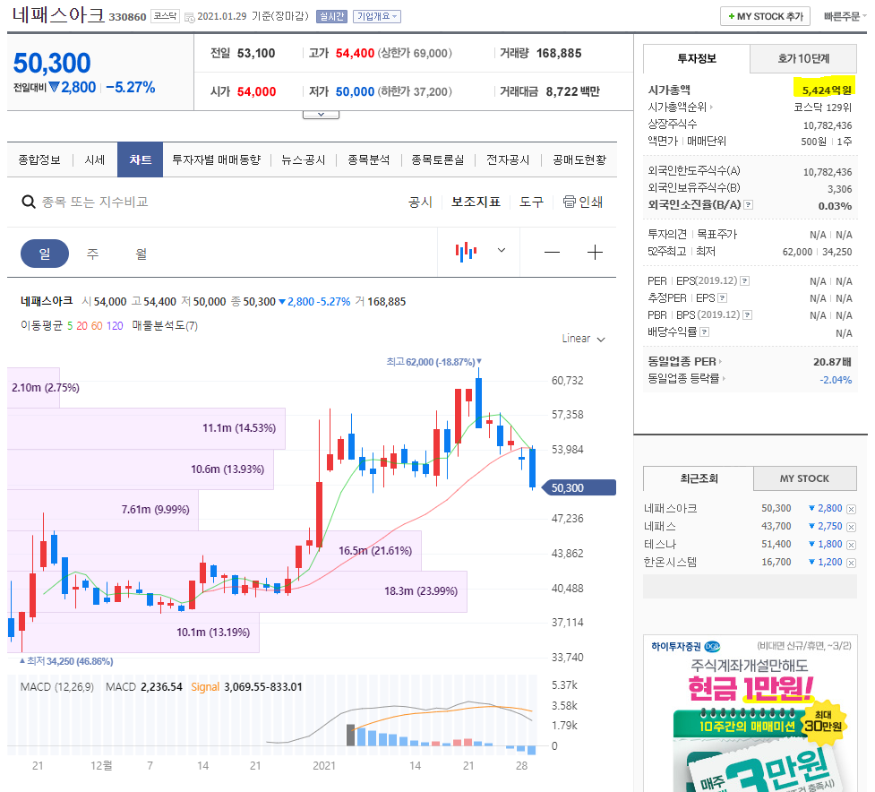 21년 1월 29일 네패스아크 주가는 50300원입니다.