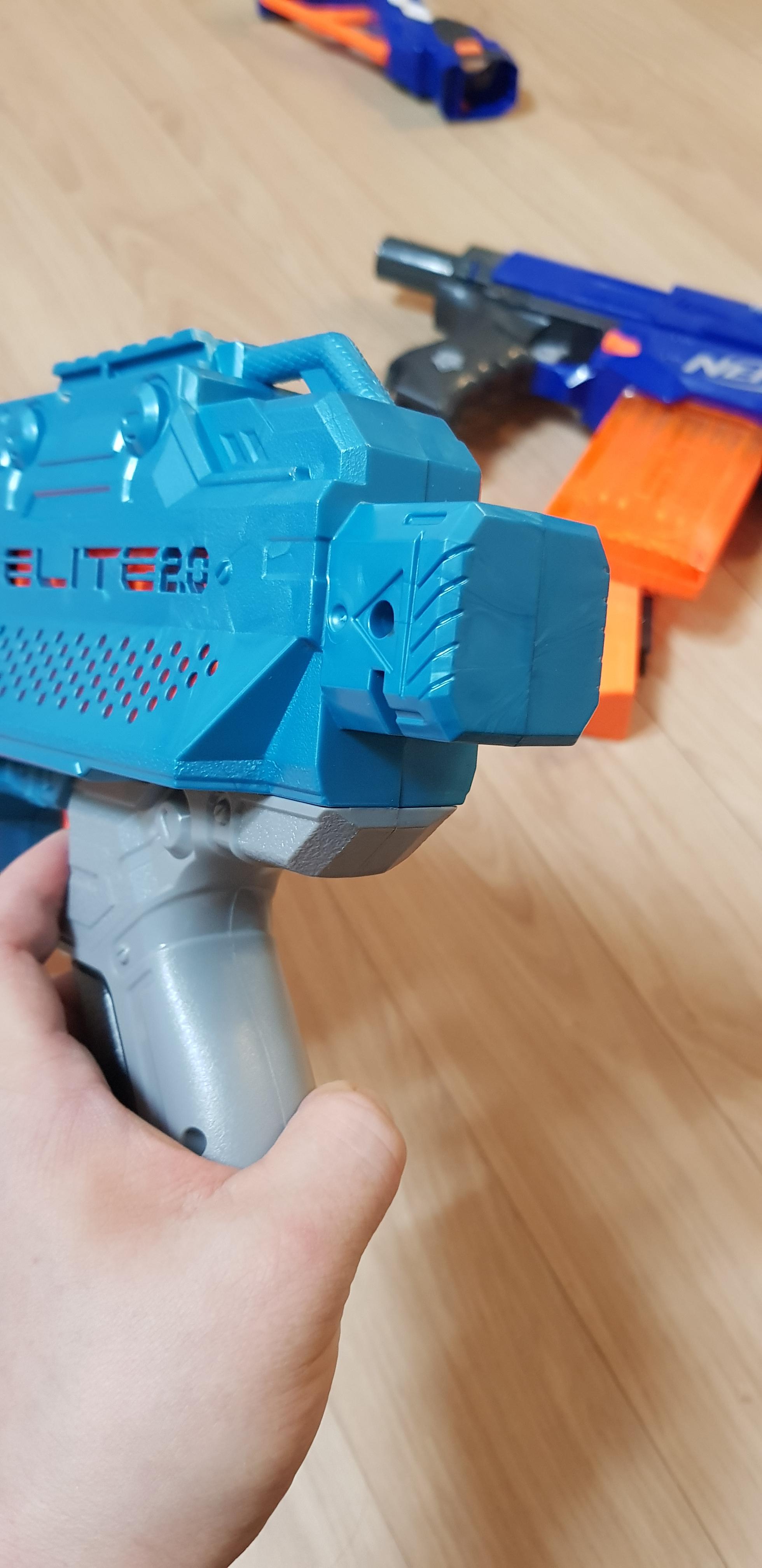 너프 엘리트 리텔리에이터의 개머리판을 연결한 모습입니다.