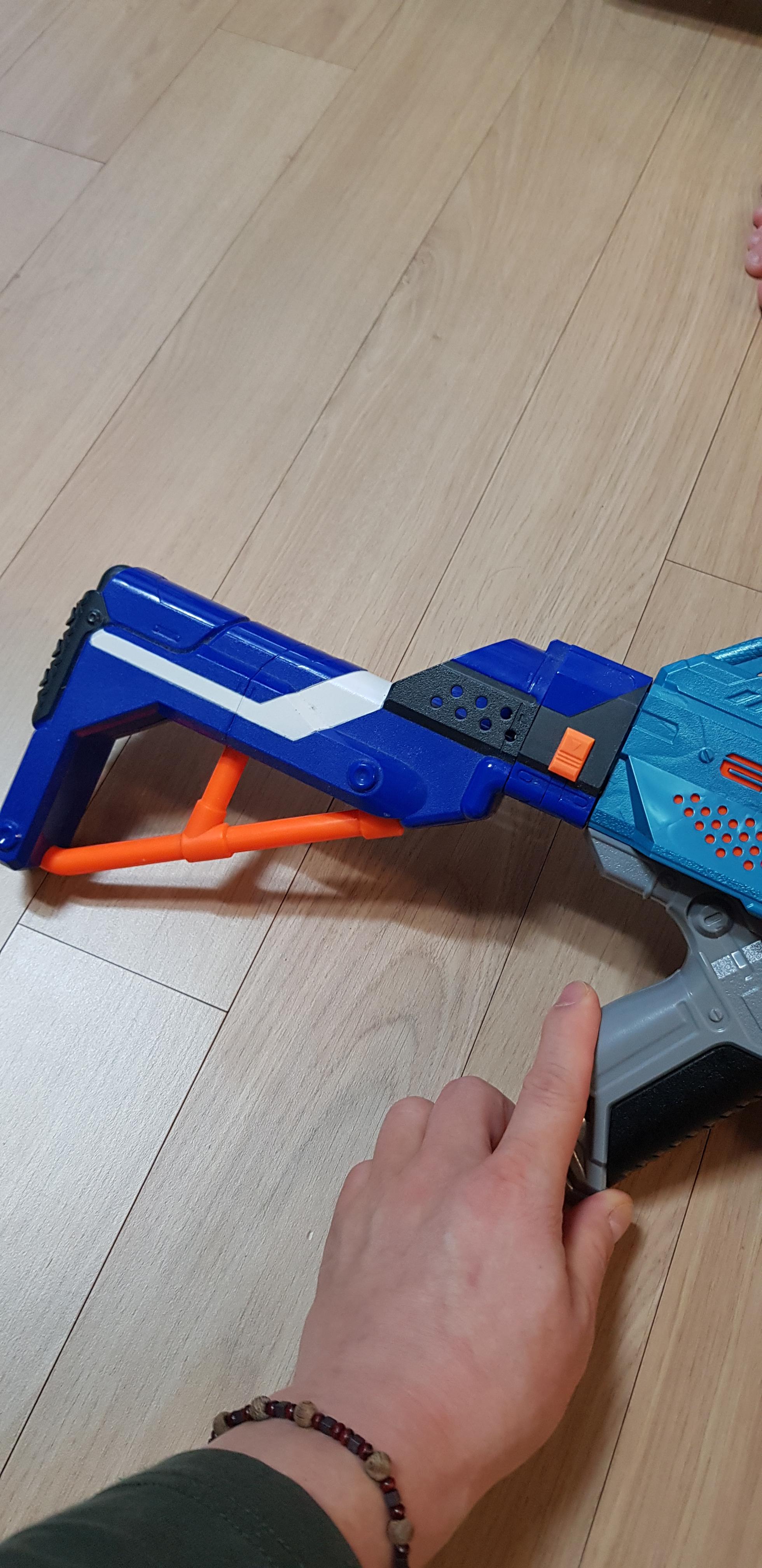 너프 엘리트 리텔리에이터의 개머리판을 연결한 모습입니다.