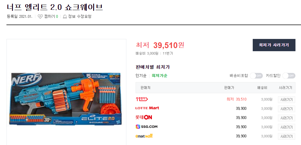 현재 네이버에서 너프 엘리트 2.0 쇼크웨이브는 39000원대입니다.