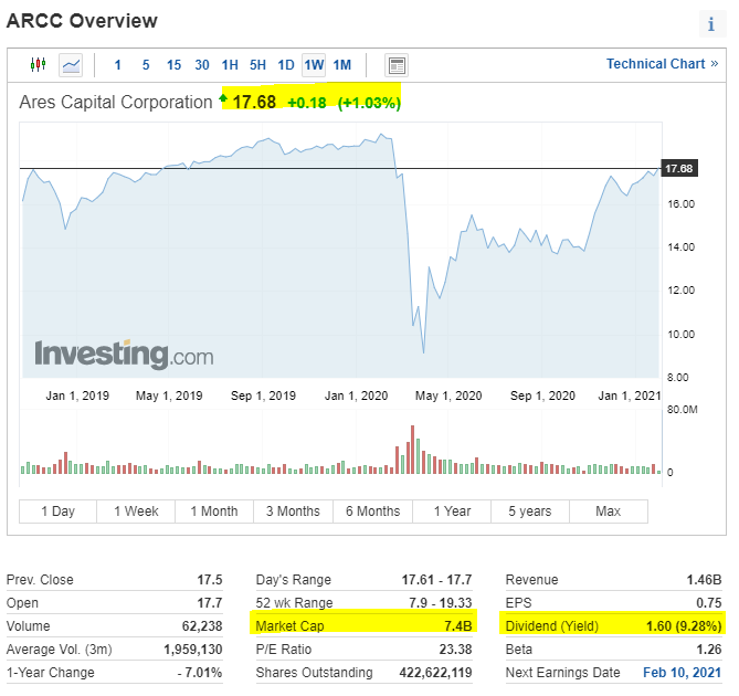 21년 2월 1일 기준 아레스 캐피탈 주가는 17.68$, 배당률은 9.28%입니다.