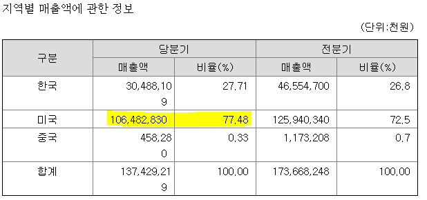 지역별 매출은 미국이 77%로 가장 높습니다.