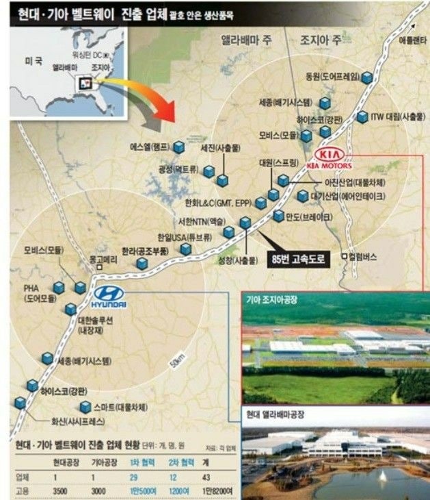 얼마전 현대차 미국 앨라배마 공장과 기아 미국 조지아 공장 근처에 같이 나가있는 협력사들이 애플카의 수혜를 입을 것 같다는 블로거들의 분석을 보고 전 감탄을 하지 않을 수 없었습니다.
