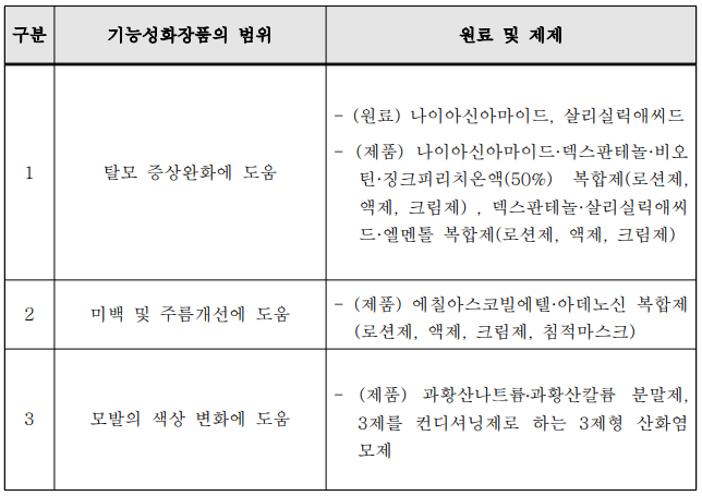 기능성화장품 심사 규정 개정(안) 행정예고 탈모 증상 완화에 도움을 주는 기능성화장품 가운데 △ 복합제로서 덱스판테놀 0.2%·살리실릭애씨드 0.25%·엘-멘톨 0.3 % △ 복합제로서 나이아신아마