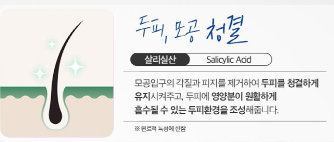 베타하이드록시산으로 피부의 기름과 피지를 녹이는 역할을 해서 각질제거에 탁월한 효능을 보이며 두피와 두피모공을 청결하게 만들어주는 기능성 원료입니다.