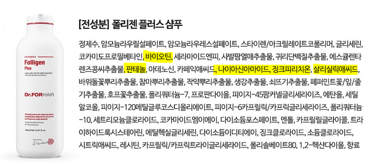제품 정보에 있는 성분을 찾아보면 비오틴, 판테놀, 나이아신아마이드, 징크피리치온, 살리실릭애씨드가 함유되어 있습니다.