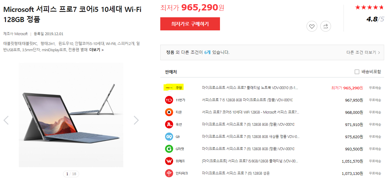 21년 2월 현재 마이크로소프트 서피스 프로7 최저가는 바로 쿠팡입니다.